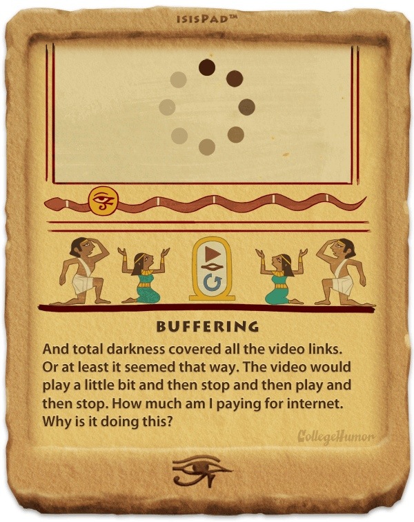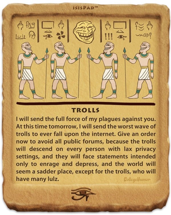 Porque durante la Semana Santa no podemos olvidarnos de las dimensiones casi bíblicas de internet, en College Humor se han propuesto recordárnoslo con estas tablas egipcias en las que, en un cómodo formato IsisPad para leer, se narran las diez plagas de la red. El spam, los trolls y las apps de Facebook son solo el comienzo. ¡Arrepentíos, insensatos, ahora que estáis a tiempo, o caerán sobre vosotros!
