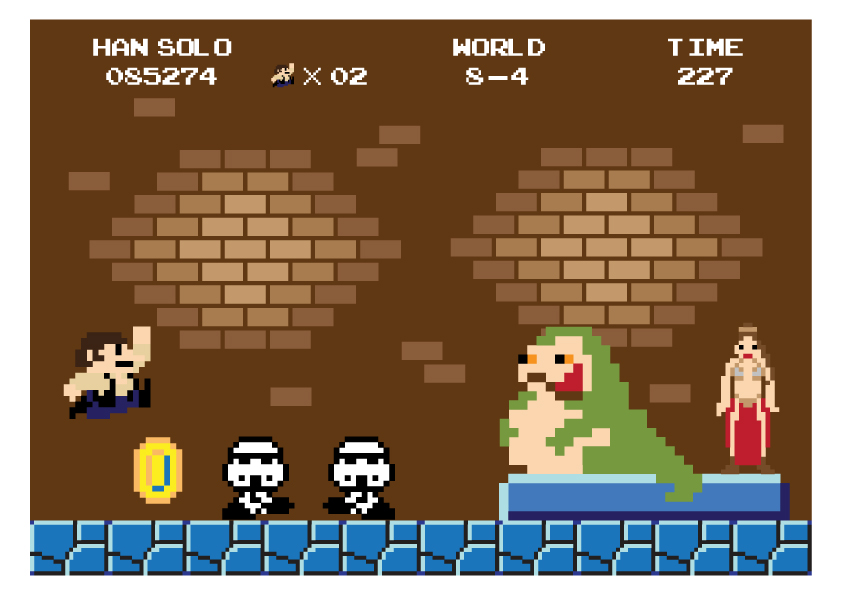 ¿Y por qué no combinar algunos de los juegos que nos han acompañado durante nuestra infancia con la saga más emblemática de nuestra niñez? El diseñador italiano Matt Cowan lo ha conseguido a la perfección con esta serie de camisetas en las que los protagonistas de Star Wars lo son a su vez de algunos de los títulos más representativos del retrogaming. Jabba Bowser y sus Goomba Troopers son de lo mejorcito que he visto en materia de mash-ups en mucho tiempo…