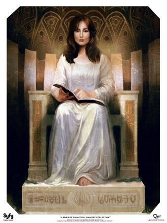 La presidenta de las Doce Colonias, Laura Roslin, aparece serenamente sentada en un trono de piedra, representada con el estilo clásico del artista francés William-Adolphe Bouguereau.