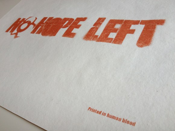 Después de que una enfermera sangrara de manera cuidadosa a los valientes, Emily Evans, artista especializada en ilustración médica, creó la pantalla de serigrafía con el claim de Resident Evil 6 “No Hope Left y una inscripción en la que se indicaba que el póster estaba impreso con sangre humana. Aunque, como la misma Miss CakeHead comenta en su blog, al ir el cartel acompañado por un paquete que rezaba “carne humana”, lógicamente, no era la parte más perturbadora del envío.