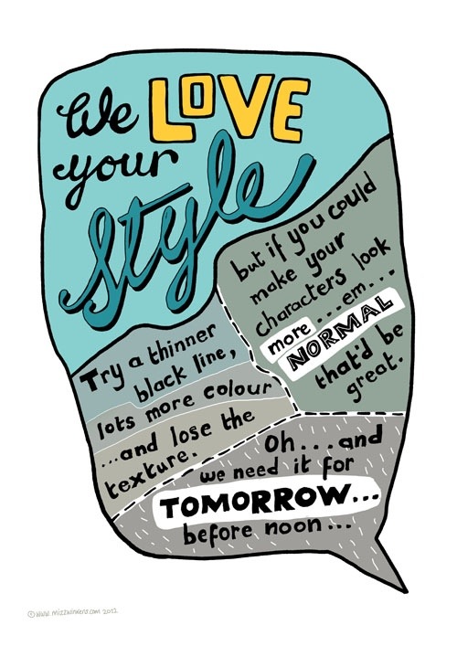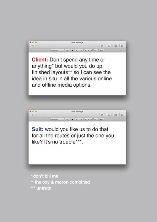 Los creativos irlandeses Mark y Paddy han recopilado buena parte del peculiar feedback recibido a lo largo de su trayectoria profesional y lo han convertido en Sharp Suits, una colección de ácidos y divertidos pósters creada por una buena causa, recaudar fondos con la venta de estas «inspiradas» frases para el hospital infantil Temple Street de Dublín. Por solo 10 € podéis hacer vuestro alguno de estos pequeños quebraderos de cabeza y, además, echar una mano. Toda la info en verysharpsuits@gmail.com.