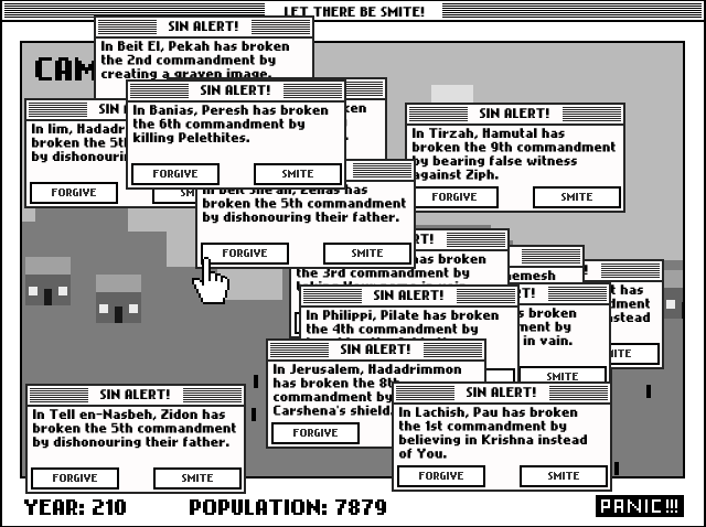 No dejéis de pasaros por su web, donde os encontraréis con un buen puñado de imaginativos y descacharrantes juegos con los que pasar el rato como Pongs, una recopilación de ¡36! versiones diferentes en las que al clásico de Atari se le añaden elementos tan dispares como tetraminos o lásers, Let’s Play: Ancient Greek Punishment en el que hay que enfrentarse a los terribles castigos que los dioses griegos imponían a los que les contrariaban o Let There Be Smite!, en el que nuestro cometido como Dios todopoderoso será castigar o perdonar a los impíos y blasfemos que infrinjan los divinos mandamientos (y en caso de agobio, mandarles un diluvio). No hace falta decir que servidora ha acabado con la humanidad unas veinte veces ya…